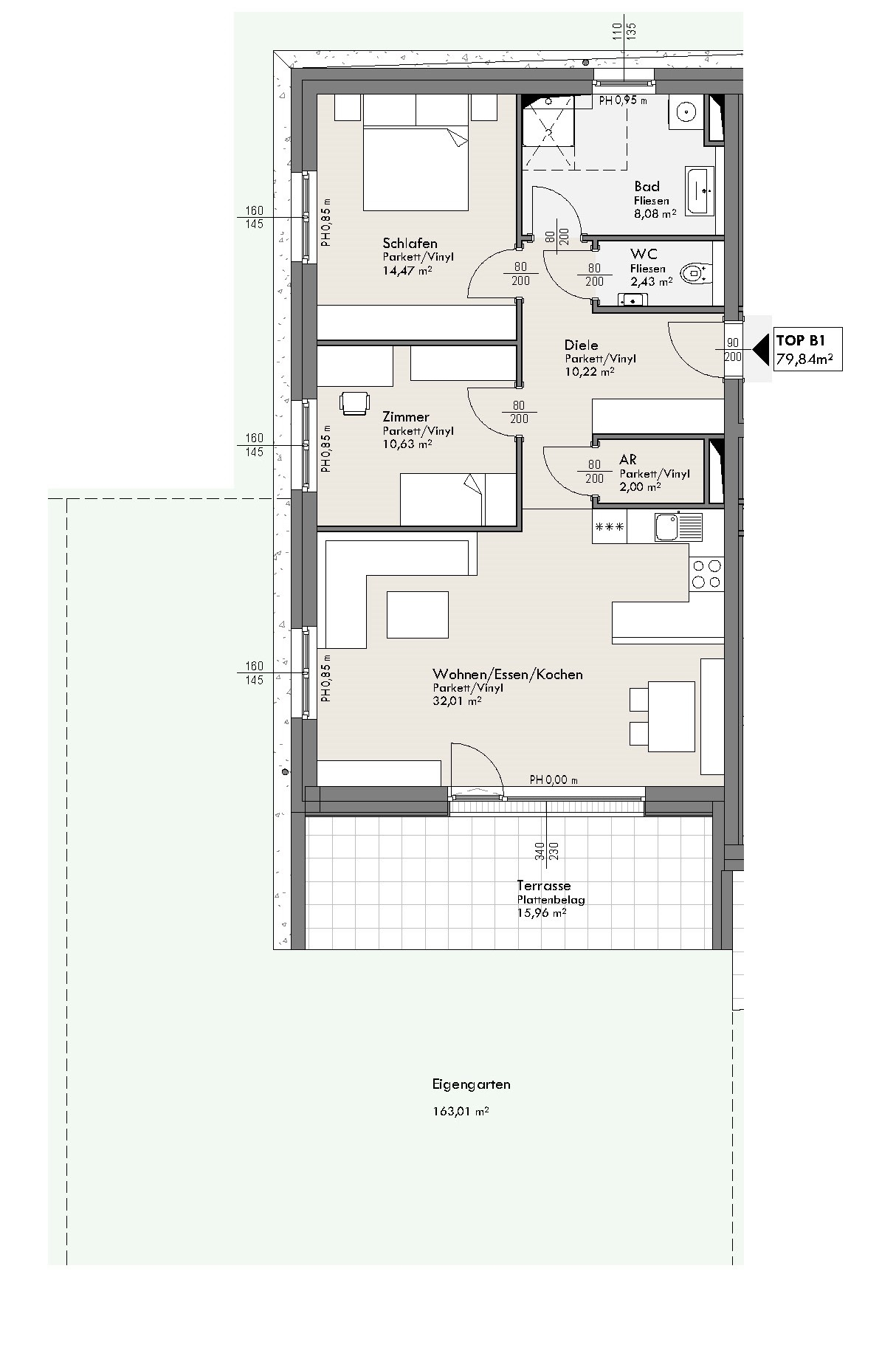 | B1 | EG | 3 | 80 m² | 16 m² | 163 m² | - | 2 | € 363.000 |