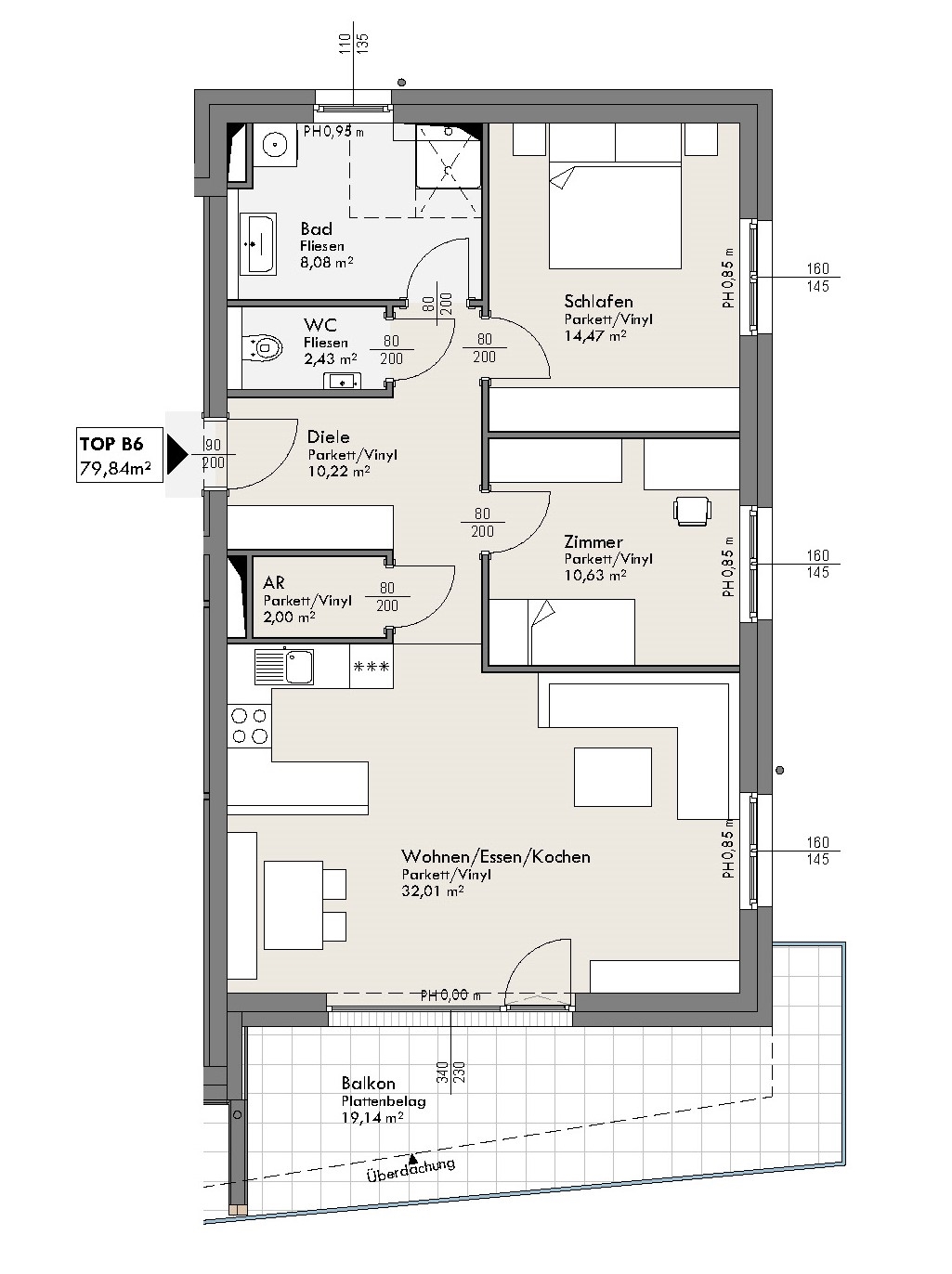 | B6 | 1.OG | 3 | 80 m² | 19 m² | - | - | 2 | € 343.000 |